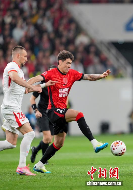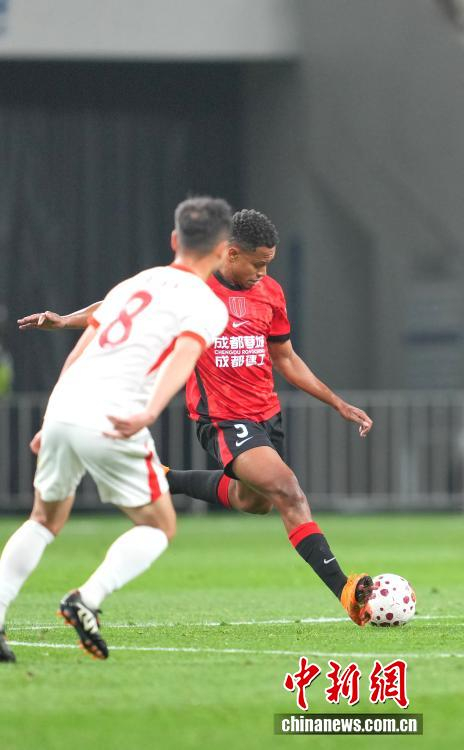 3月15日晚,四川成都,成都蓉城队队员罗慕洛(红衣)在比赛中。当日,2026赛季中超联赛第2轮比赛中,成都蓉城队主场1比0胜青岛海牛队。中新社记者 安源 摄