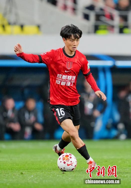 3月15日晚,四川成都,成都蓉城队队员杨明洋在比赛中。当日,2026赛季中超联赛第2轮比赛中,成都蓉城队主场1比0胜青岛海牛队。中新社记者 安源 摄