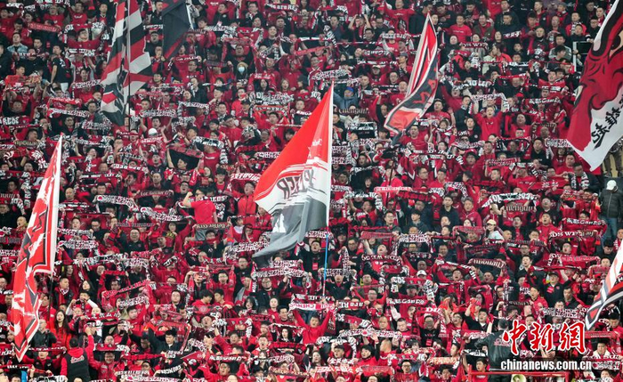 3月15日晚,四川成都,成都球迷为双方球员加油助威。当日,2026赛季中超联赛第2轮比赛中,成都蓉城队(红衣)主场1比0胜青岛海牛队。中新社记者 安源 摄
